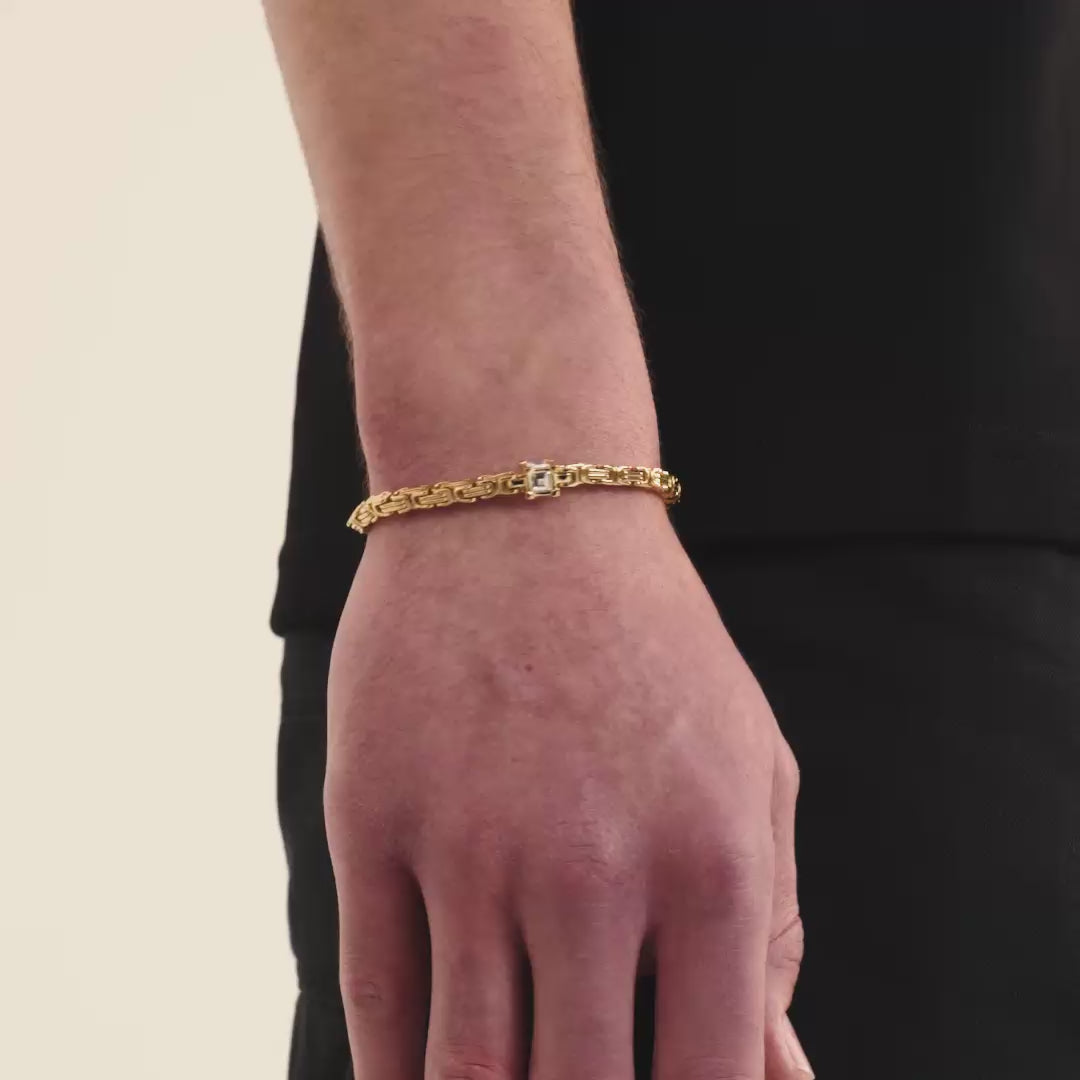 Bransoletka zachowuje charakter królewskiego splotu, ale dzięki dodanym kostkom zyskuje wyrazisty akcent. To model, który można nosić solo lub zestawić z łańcuchem z tej samej serii, tworząc pełny komplet o spójnym stylu.
