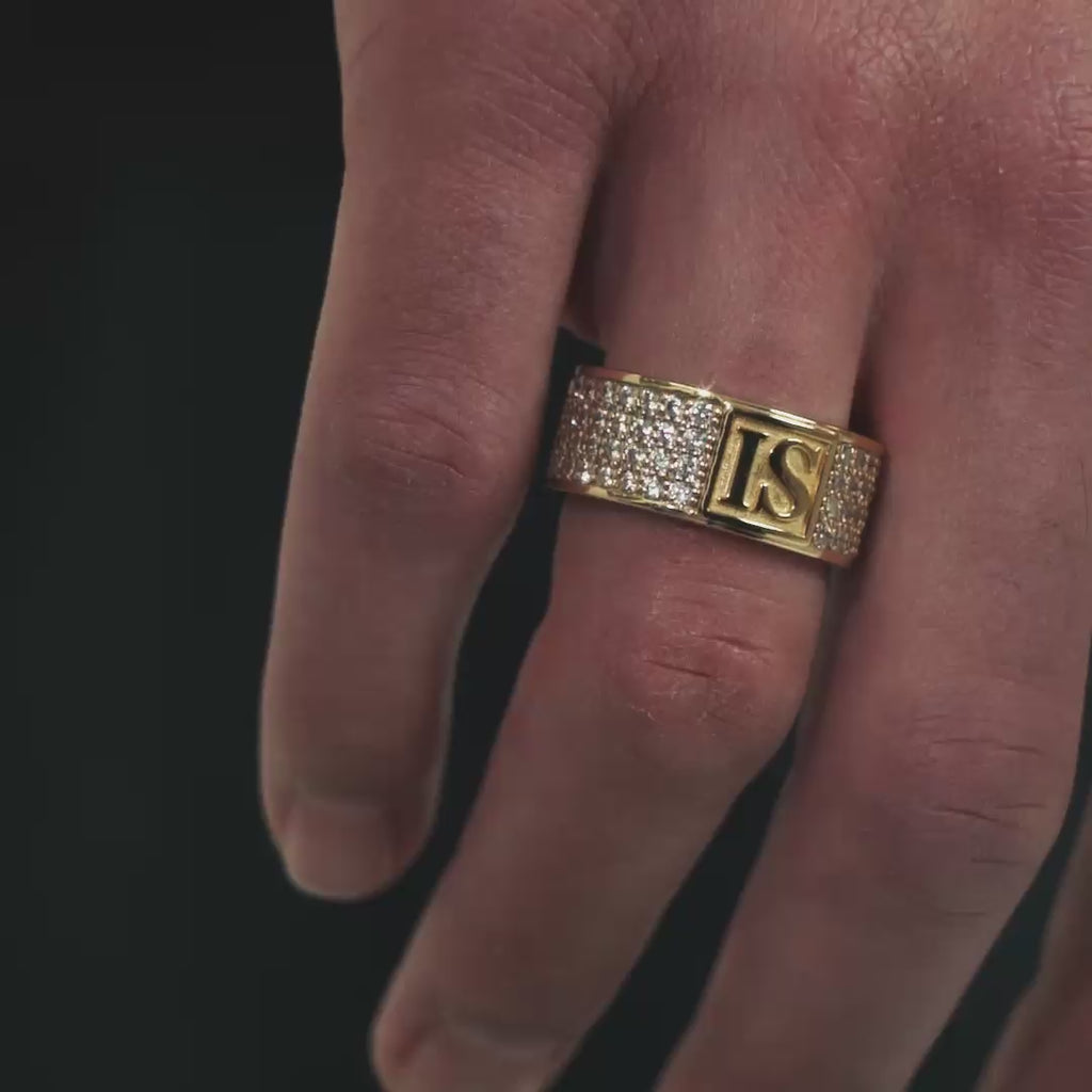 Band Diamond IS S925 Złoto to pierścień wykonany ze srebra próby 925, pokryty warstwą złota. Na froncie widoczne jest logo IS otoczone czterema rzędami ręcznie osadzonych kryształów IS. Każdy kamień został starannie dopasowany, tworząc jednolitą powierzchnię o intensywnym blasku.