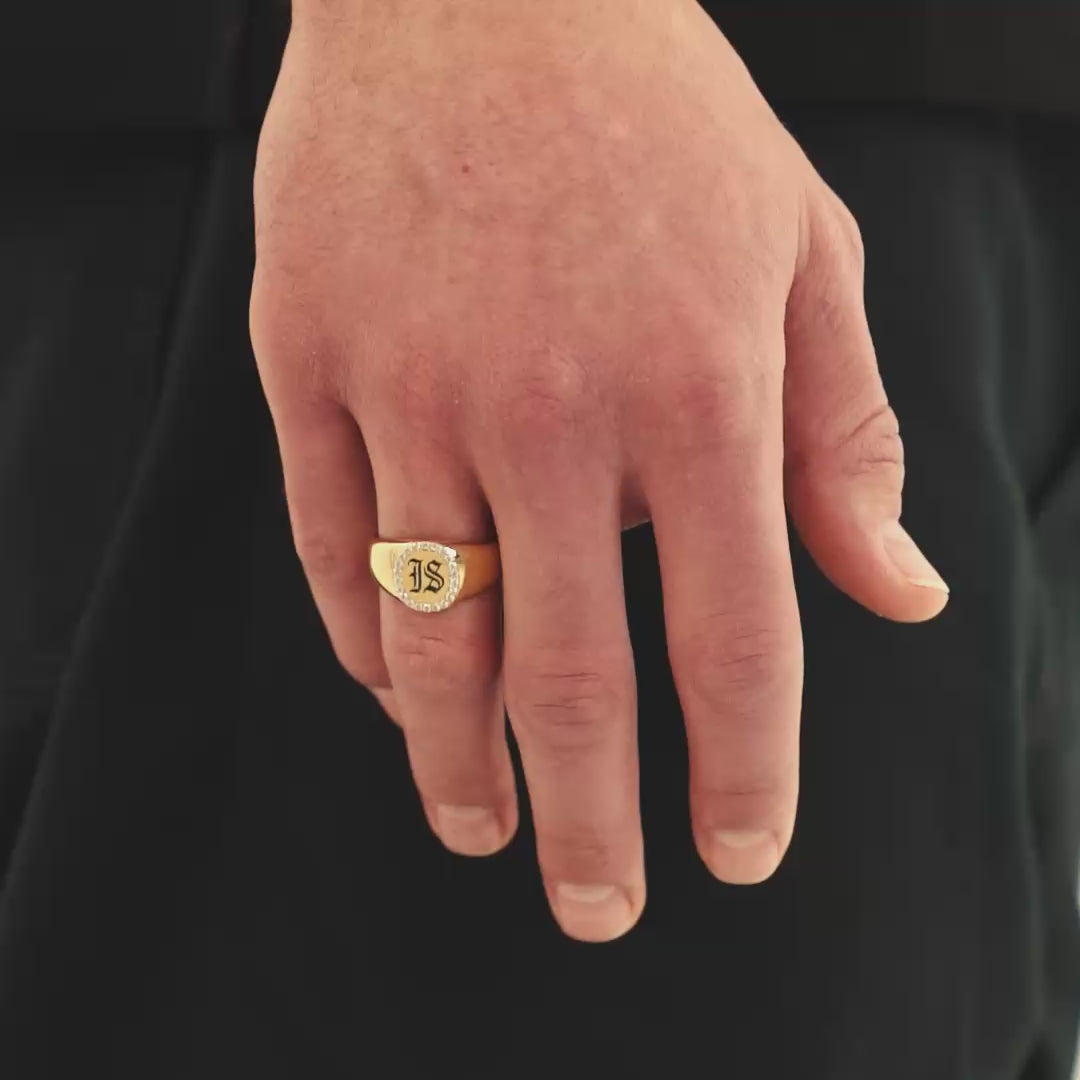 Diamond IS Gothic S925 Złoto to sygnet wykonany ze srebra próby 925, pokryty warstwą złota. Na froncie umieszczono logo IS w gotyckim kroju, otoczone pojedynczym rzędem ręcznie osadzonych kryształów IS. Kamienie tworzą symetryczny okrąg, który podkreśla kształt logo i nadaje pierścieniowi wyrazisty charakter.
