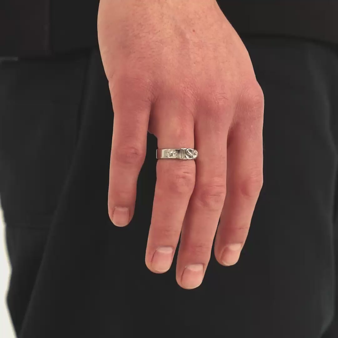 IS Star Białe Złoto to pierścień o wąskiej formie i prostym, graficznym wykończeniu. W centralnej części znajduje się odlane logo IS, a po jego bokach – dwie pięcioramienne gwiazdy. Detale zostały wykonane w jednym odlewie, co nadaje całości surowy, jednolity wygląd.