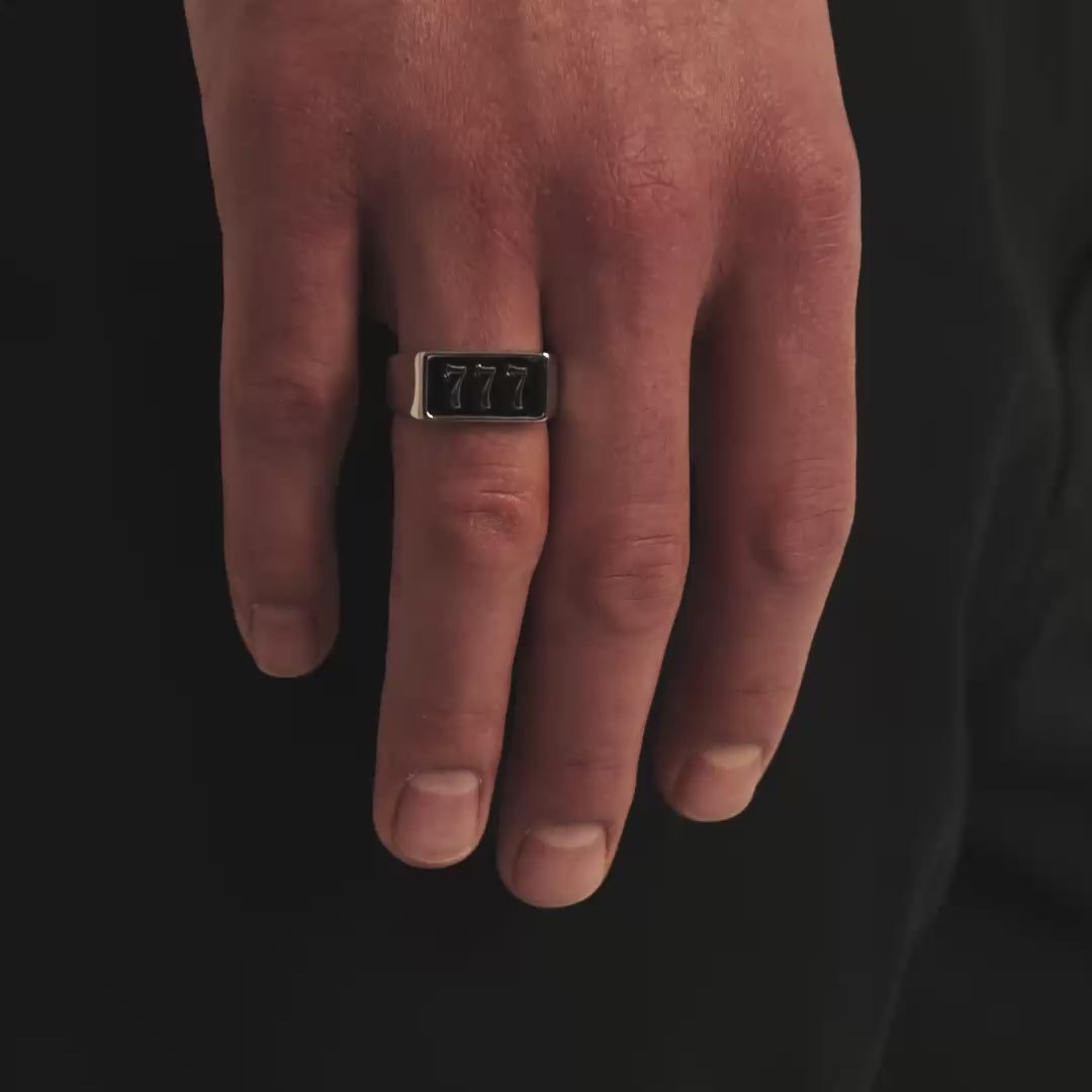 Lucky 777 Białe Złoto to sygnet o prostym, ale charakterystycznym wyglądzie. Motyw „777” został odlany w metalu i wypełniony czarną emalią, która kontrastuje z chłodnym tonem białego złota. Gładka, wypolerowana powierzchnia nadaje mu elegancji i sprawia, że pierścień przyciąga wzrok w subtelny sposób.