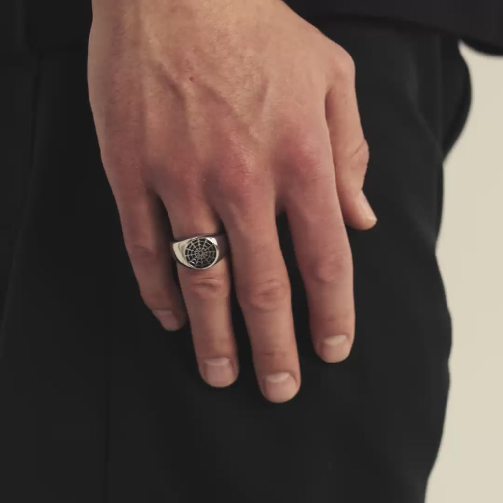 Spider Web Białe Złoto to pierścień z odlewanym motywem pajęczyny, wypełnionym czarną emalią. Ciemny wzór kontrastuje z chłodnym odcieniem białego złota, tworząc mocny, graficzny efekt. Gładka powierzchnia i precyzyjne linie sprawiają, że pierścień wygląda surowo i nowocześnie.