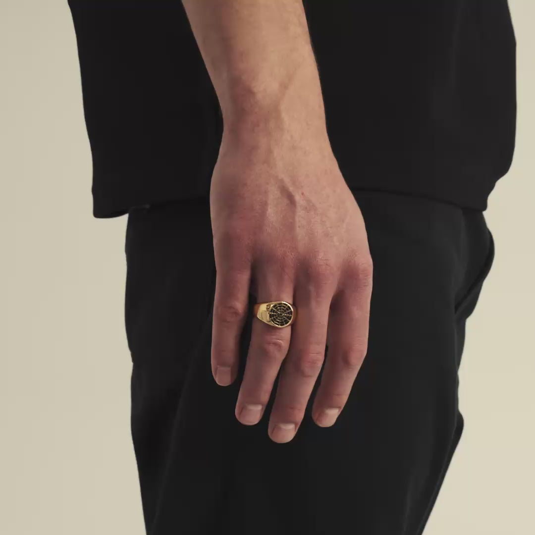 Spider Web Złoto to pierścień z odlewanym motywem pajęczyny, wypełnionym czarną emalią. Połączenie ciepłego złota i ciemnego wzoru tworzy kontrast, który nadaje całości mocny, uliczny charakter. Detal pajęczyny został wykonany z dużą precyzją, dzięki czemu pierścień przyciąga wzrok z każdej strony.